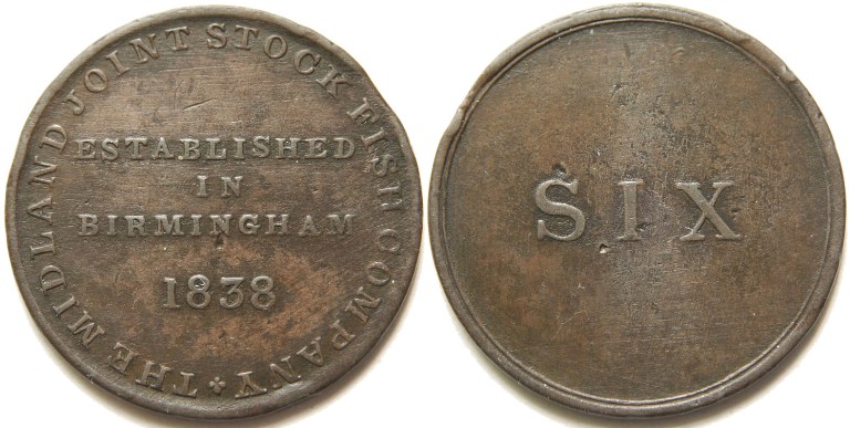 The Midland Joint Stock Fish Company Birmingham (Warwickshire) six pence dated 1838. Obverse: Legend around periphery and on four lines in centre: “THE MIDLAND JOINT STOCK FISH COMPANY + ESTABLISHED IN BIRMINGHAM 1838”. Reverse: Value in centre: “SIX”. Plain edge. Good collectable condition, see photograph. Davis: The Token Coinage of Warwickshire No: 932. Diameter 29.2mm. (↑↑) F+. £35.00 e-mail David at enquiries@abccoinsandtokens.com to order. |