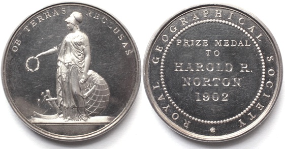 Royal Geographical Society's Prize Medal dated 1902. Obverse: Britannia standing beside a globe and sextant, holding a wreath and scroll with legend: "OB TERRAS RECLUSAS". Reverse: Legend around periphery with inscription on five lines in centre: "ROYAL GEOGRAPHICAL SOCIETY * PRIZE MEDAL TO HAROLD R. NORTON 1902". Plain edge. Lovely collectable condition, comes with original case, see photograph. Eimer No: 1652. Diameter 39.1mm. EF. £75.00 e-mail David at enquiries@abccoinsandtokens.com to order. |