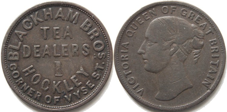 Blackham Brothers Birmingham (Warwickshire) farthing token undated. Obverse: Legend on six lines: "BLACKHAM BROs. TEA DEALERS 1 HOCKLEY CORNER OF VYSE ST.". Reverse: Bust of Queen Victoria to left with legend: "VICTORIA QUEEN OF GREAT BRITAIN". Plain edge. Good collectable condition, see photograph. TB2 No. 300. Diameter 22.2mm. (↑↑) VF. £15.00 e-mail David at enquiries@abccoinsandtokens.com to order. |
