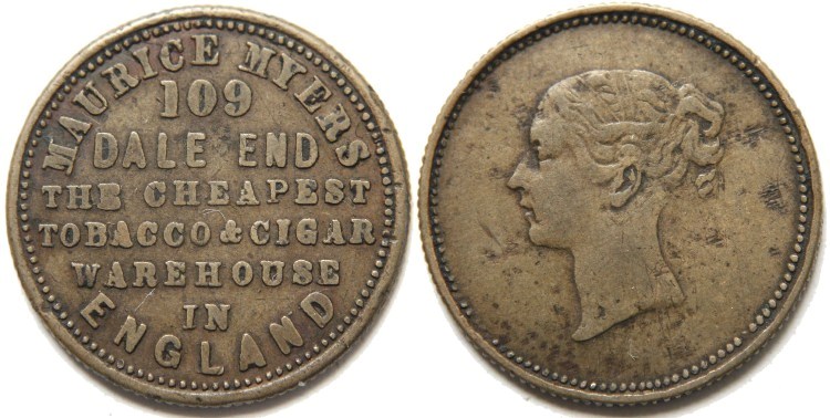 Very rare Maurice Myers' Birmingham (Warwickshire) brass farthing token undated. Obverse: Legend on eight lines, the top and bottom curved: "MAURICE MYERS 109 DALE END THE CHEAPEST TOBACCO & CIGAR WAREHOUSE IN ENGLAND". Reverse: Queen Victoria to left. Straight milled edge (|||||). Listed in Withers' "The Token Book 2" as "RR - VERY RARE". Good collectable condition, see photograph. TB2 No. 800b. Diameter 22.8mm. (↑↑) VF. £35.00 e-mail David at enquiries@abccoinsandtokens.com to order. |