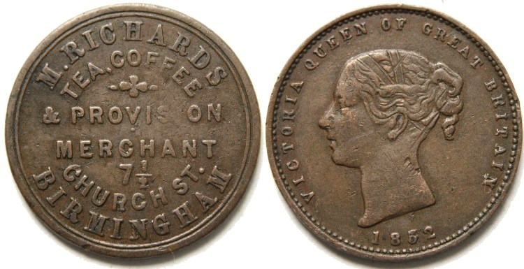 Extremely rare M Richards' Birmingham (Warwickshire) farthing token dated 1852. Obverse: Legend on seven lines, the top two and bottom two curved: "M RICHARDS TEA, COFFEE & PROVISION MERCHANT 7½ CHURCH ST. BIRMINGHAM". Reverse: Queen Victoria to left with legend: "VICTORIA QUEEN OF GREAT BRITAIN 1852". Plain edge. Listed in Withers' "The Token Book 2" as "RRR - EXTREMELY RARE". Good collectable condition with a couple of light digs, see photograph. TB2 No. 880. Diameter 22.4mm. (↑↑) VF+. £50.00 e-mail David at enquiries@abccoinsandtokens.com to order. |