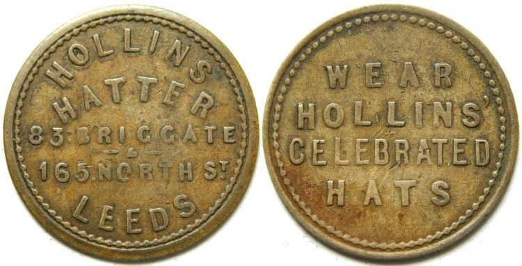 Extremely rare James Hollins' Leeds (Yorkshire) brass farthing token undated. Obverse: Legend on six lines: "HOLLINS HATTER 83 BRIGGATE - & - 165 NORTH ST LEEDS". Reverse: Legend on four lines: "WEAR HOLLINS CELEBRATED HATS". Plain edge. Listed in Withers' "The Token Book 2" as "RRR - EXTREMELY RARE". Good collectable condition, see photograph. TB2 No. 1920. Diameter 21.1mm. (↑↑) VF. £60.00 e-mail David at enquiries@abccoinsandtokens.com to order. |