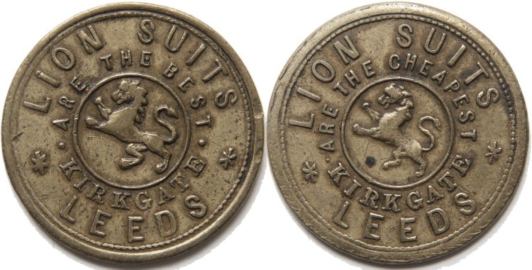 Lion Suits Leeds (Yorkshire) brass farthing token undated. Obverse: Rampant lion in centre with legend on four curved lines: "LION SUITS * ARE THE BEST • KIRGATE • LEEDS *". Reverse: Rampant lion in centre with legend on four curved lines: "LION SUITS * ARE THE BEST • KIRGATE • LEEDS *". Plain edge. Good collectable condition, see photograph. TB2 No. 1935. Diameter 22.9mm. (↑↓) VF. £10.00 e-mail David at enquiries@abccoinsandtokens.com to order. |