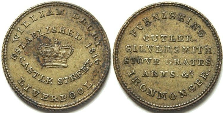 William Drury's Liverpool (Lancashire) brass farthing token undated. Obverse: Crown in centre with legend on four curved lines: "WILLIAM DRURY ESTABLISHED 1816 CASTLE STREET LIVERPOOL.". Reverse: Legend on six lines, the top and bottom curved: "FURNISHING IRONMONGER CUTLER, SILVERSMITH, STOVE GRATES, ARMS &c". Diagonally milled edge (\\\\\). Nice collectable condition with some staining, see photograph. TB2 No. 2130b. Diameter 22.1mm. (↑↑) EF-. £20.00 e-mail David at enquiries@abccoinsandtokens.com to order. |