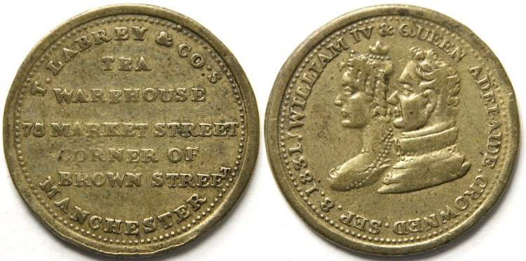 Very rare Thomas Labrey & Co's Manchester (Lancashire) brass farthing token, undated. Obverse: Legend on seven lines: “T. LABREY & CO'S TEA WAREHOUSE 78 MARKET STREET CORNER OF BROWN STREET MANCHESTER”. Reverse: Conjoined busts of William IV and Queen Adelaide with legend: “WILLIAM IV & QUEEN ADELAIDE. CROWNED. SEPT. 8. 1831”. Plain edge. Listed in Withers' "The Token Book 2" as "RR - VERY RARE". Nice collectable condition, see photograph. TB2 No. 3420. Diameter 23.8mm. (↑↑) VF+. £45.00 e-mail David at enquiries@abccoinsandtokens.com to order. |