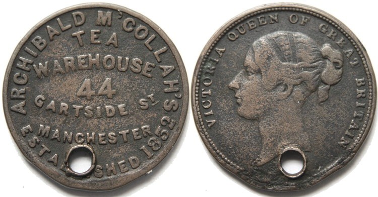 Extremely rare Archibald M'Collah's Manchester (Lancashire) farthing token undated. Obverse: Legend on seven lines: "ARCHIBALD M'COLLAH'S TEA WAREHOUSE 44 GARTSIDE ST MANCHESTER ESTABLISHED 1852". Reverse: Queen Victoria to left with legend: "VICTORIA QUEEN OF GREAT BRITAIN". Plain edge. Listed in Withers' "The Token Book 2" as "RRR - EXTREMELY RARE". Large piercing, otherwise in reasonable collectable condition, see photograph. TB2 No. 3447. Diameter 22.4mm. (↑↑) F. £15.00 e-mail David at enquiries@abccoinsandtokens.com to order. |