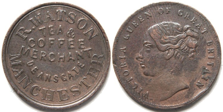 Extremely rare Robert Watson's Manchester (Lancashire) farthing token undated. Obverse: Legend on six lines: "R. WATSON TEA & COFFEE MERCHANT DEANSGATE MANCHESTER". Reverse: Bust of Queen Victoria to left with legend: "VICTORIA QUEEN OF GREAT BRITAIN". Plain edge. Listed in Withers' "The Token Book 2" as "RRR - EXTREMELY RARE". Good collectable condition with uneven colour, cleaned in the past, see photograph. TB2 No: 3580. Diameter 22.1mm. (↑↑) VF+. £30.00 e-mail David at enquiries@abccoinsandtokens.com to order. |