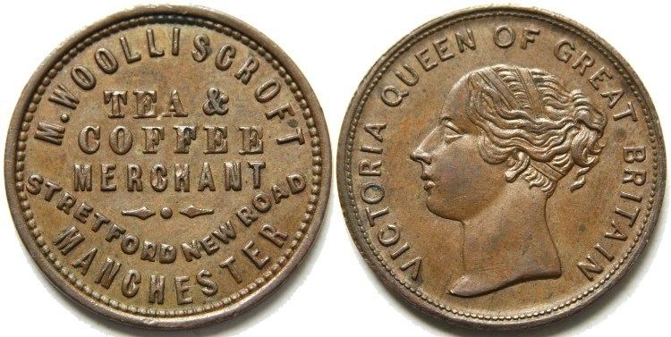 Micah Woolliscroft's Manchester (Lancashire) farthing token undated. Obverse: Legend on six lines, the top and bottom two curved: "MICAH WOOLLISCROFT TEA & COFFEE MERCHANT -•- STRETFORD NEW ROAD MANCHESTER". Reverse: Bust of Queen Victoria to left with legend: "VICTORIA QUEEN OF GREAT BRITAIN". Plain edge. Nice collectable condition, see photograph. TB2 No. 3640. Diameter 22.3mm. (↑↑) EF. £25.00 e-mail David at enquiries@abccoinsandtokens.com to order. |