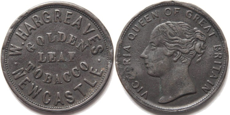 William Hargreaves' Newcastle under Lyme (Staffordshire) farthing token undated. Obverse: Legend on five lines, the top two and bottom two curved: "W. HARGREAVES • GOLDEN LEAF TOBACCO • NEWCASTLE". Reverse: Bust of Queen Victoria to left with legend: "VICTORIA QUEEN OF GREAT BRITAIN". Plain edge. Reasonable collectable condition with a couple of light crimps, see photograph. TB2 No. 3740. Diameter 22.1mm. (↑↑) VF. £10.00 e-mail David at enquiries@abccoinsandtokens.com to order. |