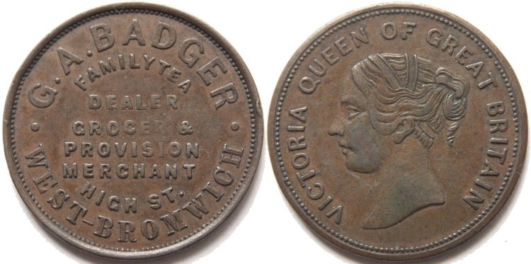 Very rare George Badger's West Bromwich (Staffordshire) farthing token undated. Obverse: Legend on eight lines: "G. A. BADGER • FAMILY TEA DEALER GROCER & PROVISION MERCHANT HIGH ST. • WEST-BROMWICH". Reverse: Bust of Queen Victoria to left with legend: "VICTORIA QUEEN OF GREAT BRITAIN". Plain edge. Listed in Withers' "The Token Book 2" as "RR - VERY RARE". Nice collectable condition, see photograph. TB2 No. 5030. Diameter 22.1mm. (↑↑) VF+. £50.00 e-mail David at enquiries@abccoinsandtokens.com to order. |