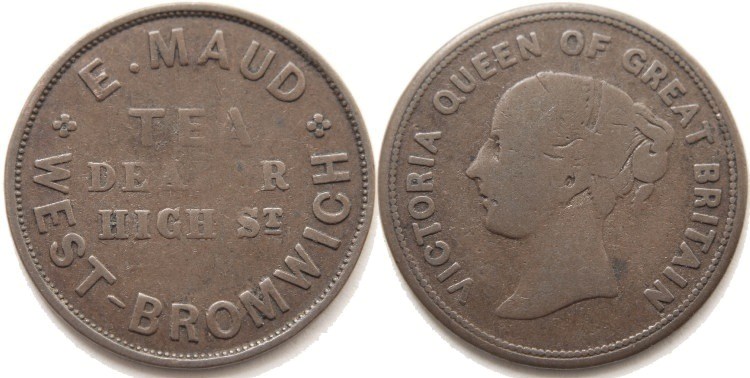 Rare Edward Maud's West Bromwich (Staffordshire) farthing token undated. Obverse: Legend on five lines: "E. MAUD + TEA DEALER + HIGH ST WEST-BROMWICH". Reverse: Bust of Queen Victoria to left with legend: "VICTORIA QUEEN OF GREAT BRITAIN". Plain edge. Listed in Withers' "The Token Book 2" as "R - RARE". Good collectable condition, see photograph. TB2 No. 5040. Diameter 22.1mm. (↑↑) F. £20.00 e-mail David at enquiries@abccoinsandtokens.com to order. |