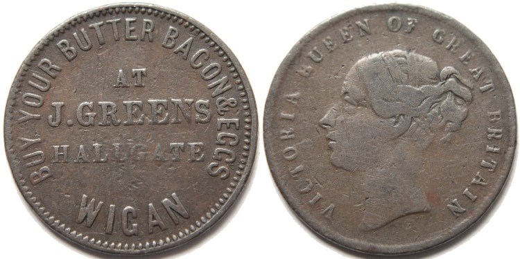 Rare John Green's Wigan (Lancashire) farthing token undated. Obverse: Legend on five lines, the top and bottom curved: "BUY YOUR BUTTER BACON & EGGS AT J. GREENS HALLGATE WIGAN". Reverse: Bust of Queen Victoria to left with legend: "VICTORIA QUEEN OF GREAT BRITAIN". Plain edge. Listed in Withers' "The Token Book 2" as "R - RARE". Good collectable condition, see photograph. TB2 No. 5100. Diameter 22.2mm. (↑↓) F+. £15.00 e-mail David at enquiries@abccoinsandtokens.com to order. |