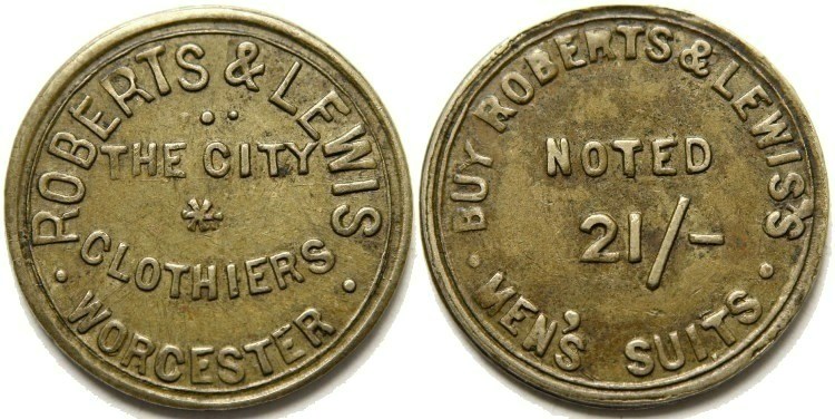 Rare Roberts & Lewis Worcester (Worcestershire) brass farthing token undated. Obverse: Legend on four lines: "ROBERTS & LEWIS • THE CITY * CLOTHIERS • WORCESTER". Reverse: Legend on four lines: "BUY ROBERTS & LEWIS'S • NOTED 21/- • MEN'S SUITS". Plain edge. Listed in Withers' "The Token Book 2" as "R - RARE". Nice collectable condition, see photograph. TB2 No. 5223. Diameter 21.1mm. (↑↑) VF+. £35.00 e-mail David at enquiries@abccoinsandtokens.com to order. |