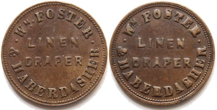William Foster's Belfast (County Antrim) farthing token undated. Obverse: Legend on four lines, the top and bottom curved: "WM FOSTER • LINEN DRAPER • & HABERDASHER". Reverse: Legend on four lines, the top and bottom curved: "WM • FOSTER • LINEN DRAPER • & HABERDASHER". Plain edge. Good collectable condition, see photograph. TB2 No: 5430. Diameter 20.8mm. (↑↓) VF. £15.00 e-mail David at enquiries@abccoinsandtokens.com to order. |