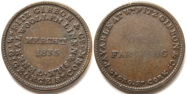 William Fitzgibbon & Co. Cork (County Cork) farthing token dated 1835. Obverse: Legend on five lines: "WM FITZ GIBBON & Co. • GENERAL WOOLLEN LINEN & SILK • MERCHTS GT GEORGE ST CORK • 1835". Reverse: Legend on four lines: "ONE FARTHING PAYABLE AT WM FITZ GIBBON & Co GT GEO. ST CORK". Plain edge. William Fitzgibbon & Co. were merchants trading at 42, 43 & 44 Great George Street, Cork. Good collectable condition, see photograph. TB2 No: 5730. Diameter 21.0mm. (↑↑) VF-. £8.00 e-mail David at enquiries@abccoinsandtokens.com to order. |