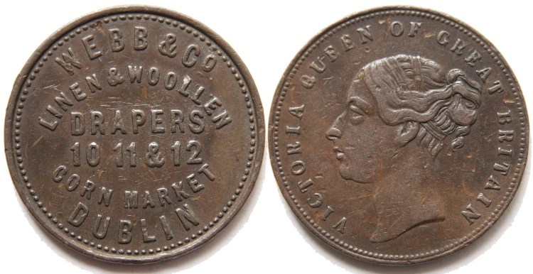 Webb & Co. Dublin (County Dublin) farthing token undated. Obverse: Legend on six lines: "WEBB & Co LINEN & WOOLLEN DRAPERS 10 11 & 12 CORN MARKET DUBLIN". Reverse: Bust of Queen Victoria to left with legend: "VICTORIA QUEEN OF GREAT BRITAIN". Plain edge. James Henry Webb & Co. were linen and woollen drapers trading from 10-12 Corn Market, Dublin. Good collectable condition, see photograph. TB2 No: 6350. Diameter 22.1mm. VF. £10.00 e-mail David at enquiries@abccoinsandtokens.com to order. |