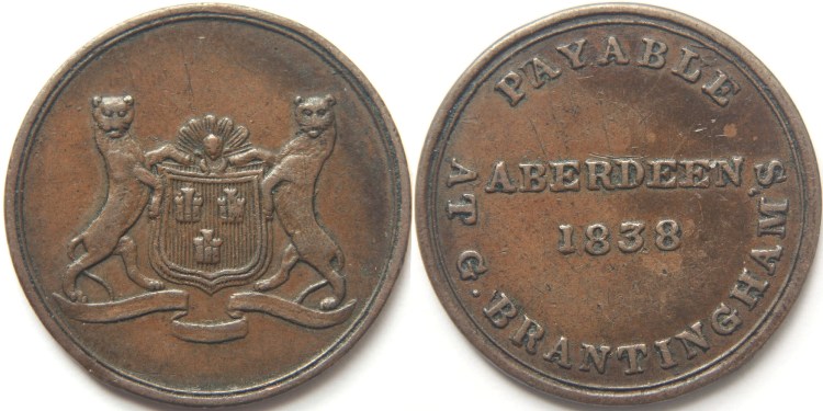 Scarce Brantingham's Aberdeen copper farthing token dated 1838. Obverse: The Coat of Arms of the City of Aberdeen consisting of two leopards supporting a three-castled shield with a head and feathers above. Reverse: Legend on two lines in centre and round periphery: "PAYABLE AT G. BRANTINGHAM'S ABERDEEN 1838". Plain edge. Listed in Bell's "Unofficial Farthings - A Supplement" as "SCARCE". Good collectable condition, see photograph. TB2/Bell No: 6930, Seaby No: ST 567. Diameter 21.5mm. (↑↑) VF. £15.00 e-mail David at enquiries@abccoinsandtokens.com to order. |