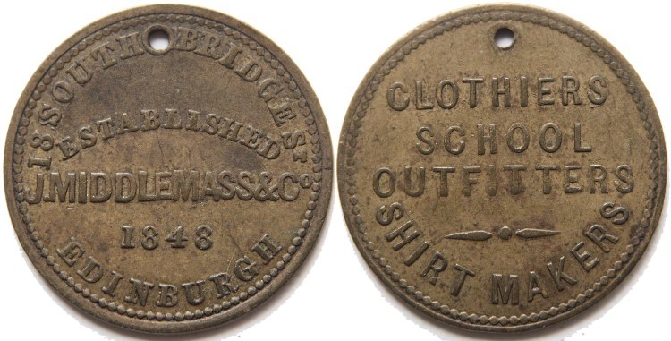 J. Middlemass' Edinburgh (Lothians) brass farthing token undated. Obverse: Legend on five lines: "J MIDDLEMASS & Co 18 SOUTH BRIDGE ST EDINBURGH ESTABLISHED 1848". Reverse: Legend on four lines: "CLOTHIERS SCHOOL OUTFITTERS SHIRT MAKERS". Plain edge. Good collectable condition, pierced as issued, see photograph. TB2 No: 7205. Diameter 24.7mm. (↑↑) VF+. £20.00 e-mail David at enquiries@abccoinsandtokens.com to order. |
