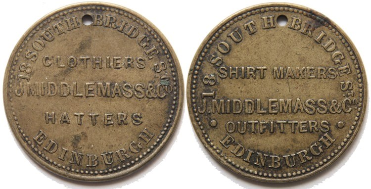 Very rare J. Middlemass' Edinburgh (Lothians) brass farthing token undated. Obverse: Legend on five lines: "J MIDDLEMASS & Co 18 SOUTH BRIDGE ST EDINBURGH CLOTHIERS HATTERS". Reverse: Legend on five lines: "J MIDDLEMASS & Co 18 SOUTH BRIDGE ST • EDINBURGH • SHIRT MAKERS OUTFITTERS". Plain edge. Listed in Withers' "The Token Book 2" as "RR - VERY RARE". Good collectable condition, pierced as issued, see photograph. TB2 No: 7207. Diameter 24.3mm. (↑↑) VF+. £25.00 e-mail David at enquiries@abccoinsandtokens.com to order. |
