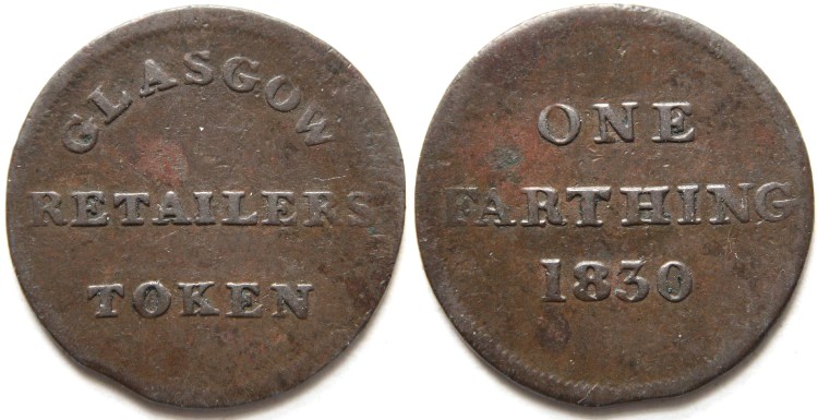 Glasgow Retailers (Lanarkshire) copper farthing token dated 1830. Obverse: Legend on three lines, the top curved: "GLASGOW RETAILERS TOKEN". Reverse: Legend on three lines: "ONE FARTHING 1830". Plain edge. Ex-David Pryke Collection. Reasonable collectable condition, see photograph. TB2 No: 7380. Diameter 20mm. F+. £10.00 e-mail David at enquiries@abccoinsandtokens.com to order. |