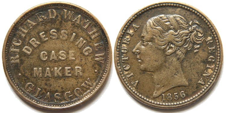 Richard Wathew's Glasgow (Lanarkshire) brass farthing token dated 1856. Obverse: Legend on five lines: "RICHARD WATHEW • DRESSING CASE MAKER • GLASGOW". Reverse: Bust of Queen Victoria to left: "VICTORIA REGINA 1856”. Straight milled edge. Good collectable condition, see photograph. Bell No: 7460. Diameter 21.9mm. (↑↑) VF. £30.00 e-mail David at enquiries@abccoinsandtokens.com to order. |