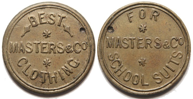 Masters and Co., (Non Local) brass farthing token undated. Obverse: Legend on three lines: "MASTERS & Co * BEST * CLOTHING". Reverse: Legend on three lines: "MASTERS & Co * FOR * SCHOOL SUITS". Plain edge. Nothing is known of the issuer. Good collectable condition but attempted piercing both sides, see photograph. TB2 No. 7840. Diameter 20.9mm. VF+. £10.00 e-mail David at enquiries@abccoinsandtokens.com to order. |