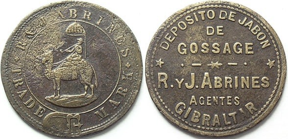 R & J Abrines Gibraltar brass token undated. Obverse: Man seated beneath parasol on camel with legend: “R & J. ABRINES + TRADE + MARK”. Reverse: Legend: “DEPOSITO DE JABON DE GOSSAGE * - * R. Y J. ABRINES AGENTES GIBRALTAR”. Straight milled edge. Reasonable collectable condition with a little pitting, cleaned in the past, see photograph. Lyall No: 1201, Diameter 28.7mm. F+. £45.00 e-mail David at enquiries@abccoinsandtokens.com to order. |