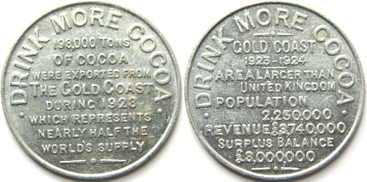 Gold Coast, Drink More Cocoa aluminium advertising check or token dated 1924. Obverse: Legend on nine lines, the top curved: "• DRINK MORE COCOA • 198,000 TONS OF COCOA WERE EXPORTED FROM THE GOLD COAST DURING 1923 WHICH REPRESENTS NEARLY HALF THE WORLD'S SUPPLY". Reverse: Legend on ten lines, the top curved: "• DRINK MORE COCOA • GOLD COAST 1923-1924 - AREA LARGER THAN UNITED KINGDOM POPULATION 2,250,000 REVENUE £3,740,000 SURPLUS BALANCE £3,000,000". Plain edge. Nice collectable condition, see photograph. Vice No: 14. Diameter 32.5mm. (↑↑) EF. £10.00 e-mail David at enquiries@abccoinsandtokens.com to order. |