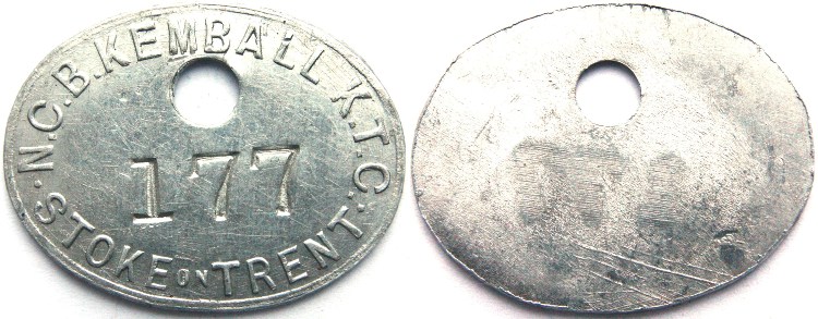 Kemball Colliery (Staffordshire) uniface pierced aluminium oval check undated. Obverse: Legend and number on three lines, the top and bottom curved: "N. C. B. KEMBALL K.T.C. • 177 • STOKE ON TRENT". Kemball Colliery was very long-lived and commenced production in 1856 and eventually closed in in 1968 due to geological problems. Latterly it was mainly used to train new miners. Good collectable condition, see photograph. Dimensions 30.2x39.1mm. VF. £15.00 e-mail David at enquiries@abccoinsandtokens.com to order. |