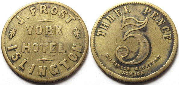 York Hotel Islington Brass Threepence Check Proprietor James Frost c1857-1867