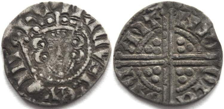 Henry III (1216-1272) silver long cross penny. Class Vb2 (c.1251-1253), Canterbury mint, moneyer Nicole with double-barred "A". Obverse: Narrow face with round eyes and sceptre with legend: "HENRICVS REX III". Reverse: Long voided cross with three pellets in each angle and pellet in centre with legend: "NIC | OLE | ONC | ANT". Reasonable collectable condition, see photograph. Spink No: S.1368A. Diameter 17.6mm. F+. £55.00 e-mail David at enquiries@abccoinsandtokens.com to order. |