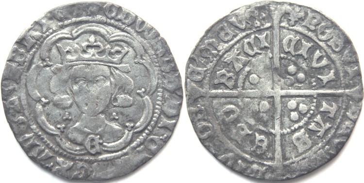 Edward IV first reign (1461-1470) silver hammered groat, Light Coinage (1464-1470), mint mark lis (1461-1464), York mint. Obverse: Facing crowned bust with trefoils either side of neck, "E" on bust, within tressure of nine arcs, trefoils on cusps, single trefoil stops and legend: "♣EDWARD DI ˔ GRA ˔ REX ˔ ANGL Z FRANC". Reverse: Long cross with three pellets in each quarter and legend: "♣POSVI | DEVMA | DIVTOR | EM MEVM" and "CIVI | TAS | EBO | RACI". Ex-Warkworth School Hoard, comes with British Museum envelope and identification. Good collectable condition, see photograph. Spink No: S.2014, North Class XI. Diameter 26.0mm. F+. £225.00 e-mail David at enquiries@abccoinsandtokens.com to order. |