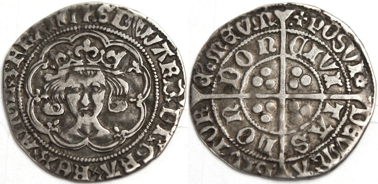 Edward IV second reign (1471-1483) silver London groat, Class XVIIIb, mint mark pierced cross with pellet at side (1477-1480). Obverse: Facing bust, no marks by neck, tressure of nine arcs with fleurs on cusps but not on breast or over crown, double and single saltire stops in legend: "+EDWARDxxDIxxGRAxREXxANGLxZxFRANC". Reverse: Long cross with three pellets in each quarter, double and single saltire stops and rose after "POSVI" and "ADIVTORE", with legends: "+POSVI* | DEVMxxA | DIVTOR | E*MEVMx" and "CIVI | TAS | LON| DON". Nice collectable condition, see photograph. Spink No: S.2098, North Class XVIIIb. Diameter 26.1mm. VF. £275.00 e-mail David at enquiries@abccoinsandtokens.com to order. |