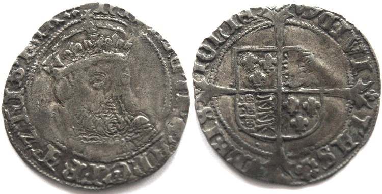 Henry VIII (1509-1547) silver hammered groat (four pence), Posthumous Coinage (1547-1551), bust 2, lis in fork ends, Bristol Mint. Obverse: Bust to right with rose mint mark and legend: "|HENRIC. 8 D' G' ANG' FRA' Z HIB' REX". Reverse: Cross over Royal Coat of Arms with "WS" mint mark, pellet on border in second quarter and below shield in third quarter with legend: "CIVI | TAS| | ⚜BRIS | TOLIE". These debased coins of poor workmanship were struck during the reign of Edward VI but bear the name and portrait of Henry VIII. Stewartby 3b, page 528. Good collectable condition for type on slightly crimped flan, see photograph. Spink No: S.2406. Diameter 26.3mm. F+. £345.00 e-mail David at enquiries@abccoinsandtokens.com to order. |