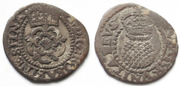 James I (1603-1625) silver hammered half groat (two pence), third coinage (1619-1625), no stops in reverse legend. Good collectable condition, see photograph. Spink No: S.2671. Diameter 16.4mm. VF-. £50.00 e-mail David at enquiries@abccoinsandtokens.com to order. |
