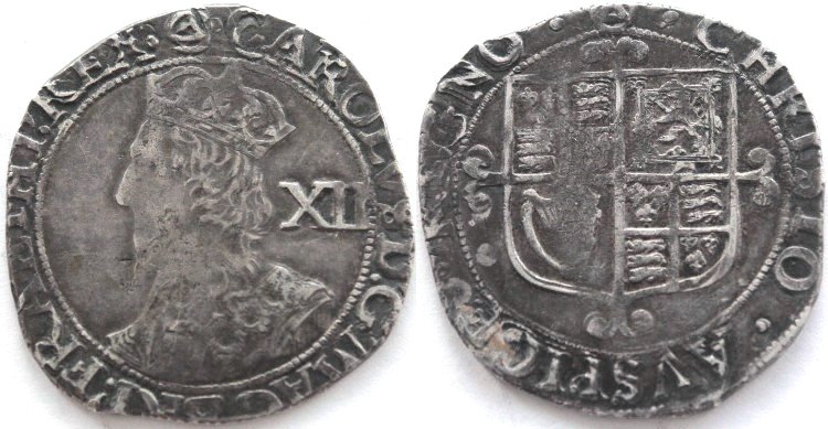 Charles I (1625-1649) silver hammered shilling, Tower Mint under control of the King, Group F, sixth (Briot's) bust, type 4.4, square topped shield with no "C R", mint mark triangle in circle (1641-1643). Reasonable collectable condition for type on usual ragged flan, see photograph. Spink No: S.2799, Sharp G1/2. Diameter 29.2mm. F+. £75.00 e-mail David at enquiries@abccoinsandtokens.com to order. |