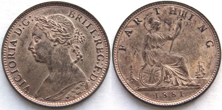 Victoria (1837-1901) bronze farthing dated 1881, bun head. Lovely collectable condition with a few hairline scratches, heavy varnish having been removed, see photograph. Spink No: S.3958, Freeman No. 546. Diameter 20.30mm. EF-. £40.00 e-mail David at mailto:enquiries@abccoinsandtokens.com?subject=Victoria Bun Head Farthing 1881 £40.00 to order. |