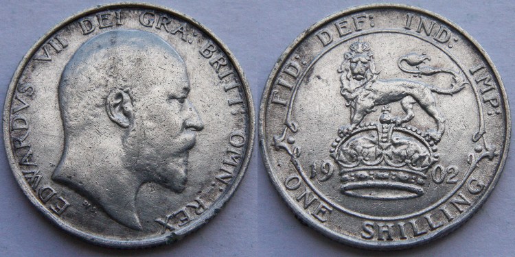 Edward VII (1901-1910) silver shilling dated 1902. Good collectable condition with edge knock, harshly cleaned in the past, see photograph.