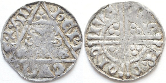 Henry III (1216-1272) silver Dublin penny, class IIa. Obverse: Crowned bust in triangle holding sceptre with legend: "HENRICVS REX III". Reverse: Voided long cross with three pellets in each angle and legend: "RICARD ON DIVE". With ticket Ex-Spink March 1977. Good collectable condition, see photograph. Spink No: 6240. Diameter 18.6mm. F+. £100.00 e-mail David at enquiries@abccoinsandtokens.com to order. |