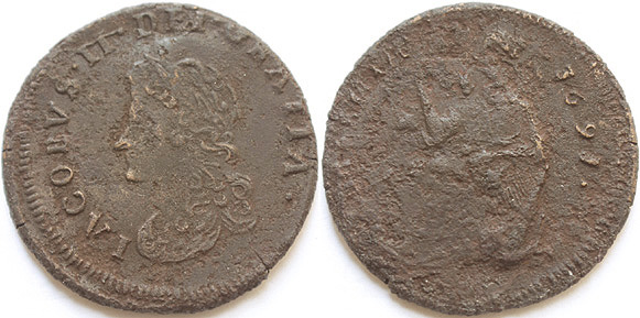 James II Gun Money halfpenny dated 1691. This was struck during the siege of Limerick (1690-91) from gun money shillings. Features of the original coin are evident. Issued after James II landed in Ireland in a bid to recapture his throne. This base metal coinage was intended to be temporary, and replaced once he succeeded in his bid, which of course, did not happen. Poor collectable condition for type, see photograph. Spink No: 6594. Diameter 26.8mm. Fair. £30.00 e-mail David at enquiries@abccoinsandtokens.com to order. |