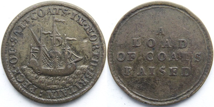 Extremely Rare Saltcoats (Ayrshire) brass harbour token undated. Obverse: Sailing ship to right with mainmast below "A" and two pennants flying, with legend: ": PECK • OF • SALTCOATS • IN • NORTH • BRITAIN". Reverse: Legend on four lines: "A LOAD OF COALS RAISED". Plain edge. Listed in Seaby's "Coins and Tokens of Scotland" as: "EXTREMELY RARE". Good collectable condition for type, see photograph. Seaby ST No: 702. Diameter 25.5mm. VF. £195.00 e-mail David at enquiries@abccoinsandtokens.com to order. |