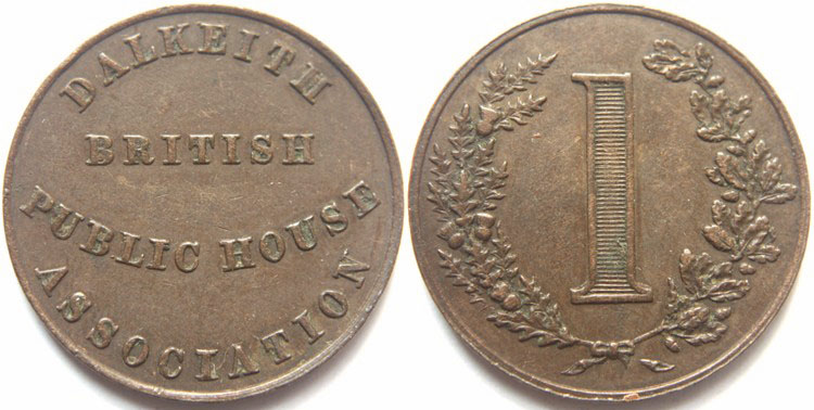 British Public House Dalkeith (Lothian) bronze penny token undated. Obverse: Legend on four lines, the top and bottom two curved: "DALKEITH BRITISH PUBLIC HOUSE ASSOCIATION". Reverse: Value in thistle and oak wreath: "1". Plain edge. Ex-Michael Paterson Collection. Good collectable condition, see photograph. TB3 No: 2379. Diameter 26.0mm. VF. £20.00 e-mail David at enquiries@abccoinsandtokens.com to order. |
