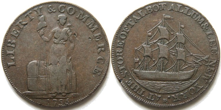 Talbot Allum & Lee New York copper cent dated 1795. Obverse: Standing figure of Commerce holding the liberty cap on a pole with a bale behind and legend: “LIBERTY & COMMERCE 1794”. Reverse: Sailing ship to right with legend: “*AT THE STORE OF TALBOT ALLUM & LEE NEW YORK.” Edge inscription: “•WE PROMISE TO PAY THE BEARER ONE CENT”. Good collectable condition for type with a couple of light digs and small edge flaw, see photograph. Breen No: 1035, Whitman No: 8620. Diameter 28.8mm. F+. £125.00 e-mail David at enquiries@abccoinsandtokens.com to order. |