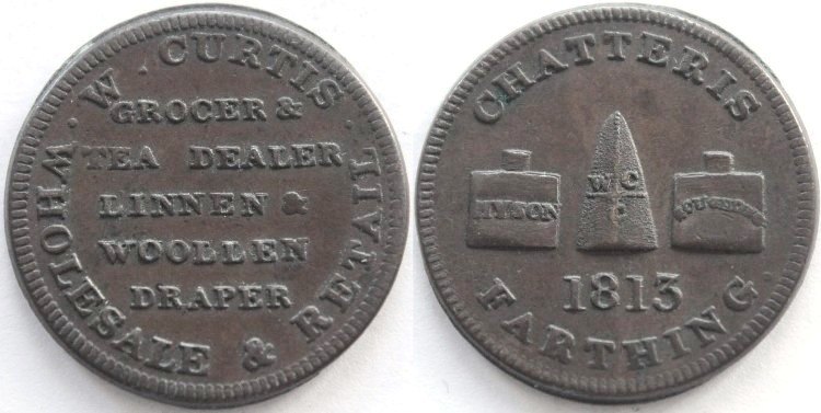 William Curtis' Chatteris (Cambridgeshire) farthing token dated 1813. Obverse: Legend on seven lines, the top and bottom curved: "W. CURTIS. WHOLESALE & RETAIL. GROCER & TEA DEALER LINNEN & WOOLLEN DRAPER". Reverse: A sugar loaf between two tea caddies labelled: "HYSON" and "SOUCHONG", with legend: "CHATTERIS FARTHING 1813". Plain edge. William Curtis was a grocer and draper with a business in Chatteris. Good collectable condition, see photograph. Withers No: 660, Davis Cambridgeshire No: 2. Diameter 21.6mm. (↑↓-350°) VF+. £15.00 e-mail David at enquiries@abccoinsandtokens.com to order. |