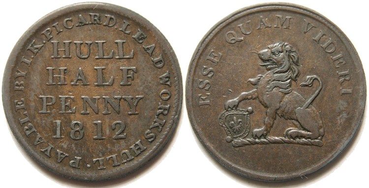 Scarce Picard’s Hull (Yorkshire) halfpenny token dated 1812. Obverse: Legend on four lines in centre and also around periphery: “HULL HALF PENNY 1812”, “PAYABLE BY I. K. PICARD. LEAD WORKS HULL.”. Reverse: Seated lion with paw on shield: “ESSE QUAM VIDERI”. Diagonally milled edge (/////). Listed in Paul & Bente Withers' “British Copper Tokens 1811-1820” as “SCARCE”. Picard, the issuer and owner of the lead works, spent some of his time in London and took to gambling his fortune away, eventually becoming bankrupt in 1827 and dying in reduced circumstances in 1843. Good collectable condition, see photograph. Withers No: 781, Davis: Yorkshire Not in.. Diameter 27mm. (↑↑) VF. £10.00 e-mail David at enquiries@abccoinsandtokens.com to order. |