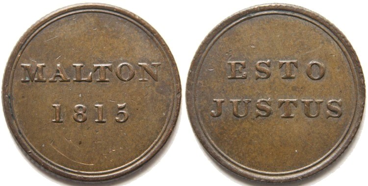 Malton (Yorkshire) copper farthing token dated 1815. Obverse: Legend on two lines: “MALTON 1815”. Reverse: Legend on two lines: “ESTO JUSTUS”. Diagonally-grained edge (//////). Good collectable condition, see photograph. Withers No: 865, Davis Yorkshire No: 119. Diameter 22.0mm. Weight 3.7g. (↑↑) VF+. £15.00 e-mail David at enquiries@abccoinsandtokens.com to order. |