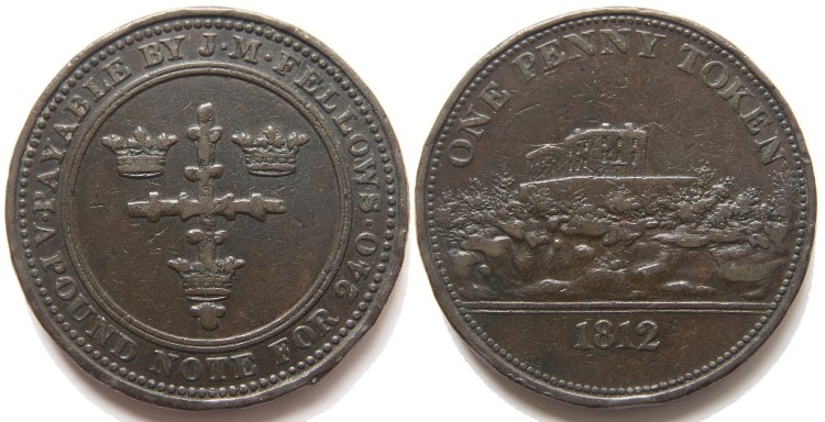 J. M. Fellows Nottingham (Nottinghamshire) copper penny token dated 1812. Obverse: Arms of three crowns and an elaborate cross in centre with legend: “A POUND NOTE FOR 240 • PAYABLE BY J • M • FELLOWS •”. Reverse: View of Nottingham Castle with legend on two lines: “ONE PENNY TOKEN 1812”. Centre grained edge (\\\\\). Good collectable condition with dark tone, see photograph. Withers No: 941, Davis Nottinghamshire No: 17. Diameter 34.7mm. (↑↓) VF. £15.00 e-mail David at enquiries@abccoinsandtokens.com to order. |