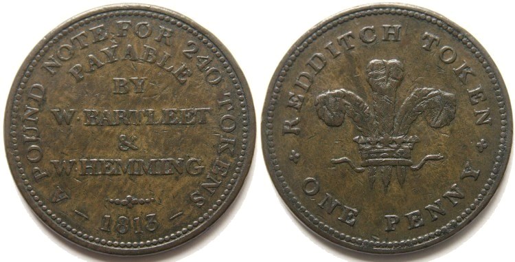 Barfleet & Hemming's Redditch (Worcestershire) copper penny token dated 1813. Obverse: Legend on seven lines: “ONE POUND NOTE FOR 240 TOKENS PAYABLE BY W•BARFLEET & W•HEMMING 1813”. Reverse: Prince of Wales feathers in centre with legend on two lines: “REDDITCH TOKEN ONE PENNY”. Centre grained edge (\\\\\). Good collectable condition, see photograph. Withers No: 960, Davis Worcestershire No: 12. Diameter 34.7mm. (↑↑) VF-. £25.00 e-mail David at enquiries@abccoinsandtokens.com to order. |