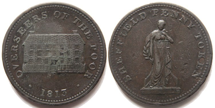 Scarce Overseers of the Poor Sheffield (Yorkshire) copper penny token dated 1813. Obverse: View of a large Georgian building – the poor house - with legend: “OVERSEERS OF THE POOR • 1813 •”. Reverse: Justice standing holding scales with legend: “SHEFFIELD PENNY TOKEN”. Centre grained edge (\\\\\). Listed in Paul & Bente Withers' "British Copper Tokens 1811-1820" as "SCARCE". Good collectable condition with uneven obverse colour, see photograph. Withers No: 991, Davis Yorkshire No: 126. Diameter 34.2mm. (↑↓) VF-. £15.00 e-mail David at enquiries@abccoinsandtokens.com to order. |