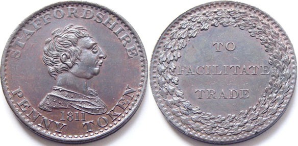 Staffordshire penny token dated 1811. Obverse: Bare-headed bust of George III to right draped in ermine with legend: "STAFFORDSHIRE PENNY TOKEN 1811". Reverse: Thick oak wreath with legend in centre: "TO FACILITATE TRADE”. Centre-grained edge (\\\\\). Nice collectable condition, see photograph. Withers No: 1100, Davis Staffordshire No: 21. Diameter 34mm. (↑↓) EF-. £40.00 e-mail David at enquiries@abccoinsandtokens.com to order. |
